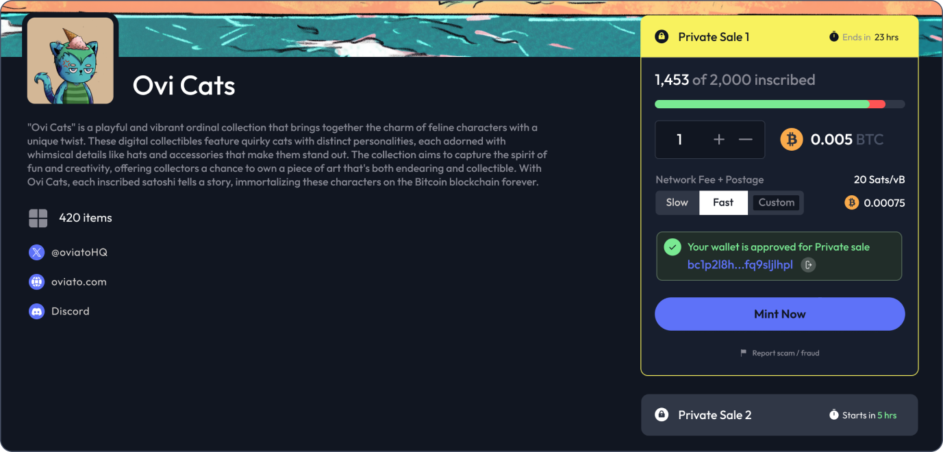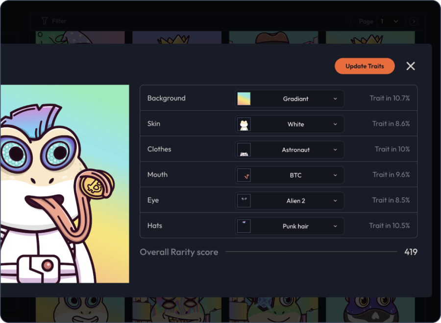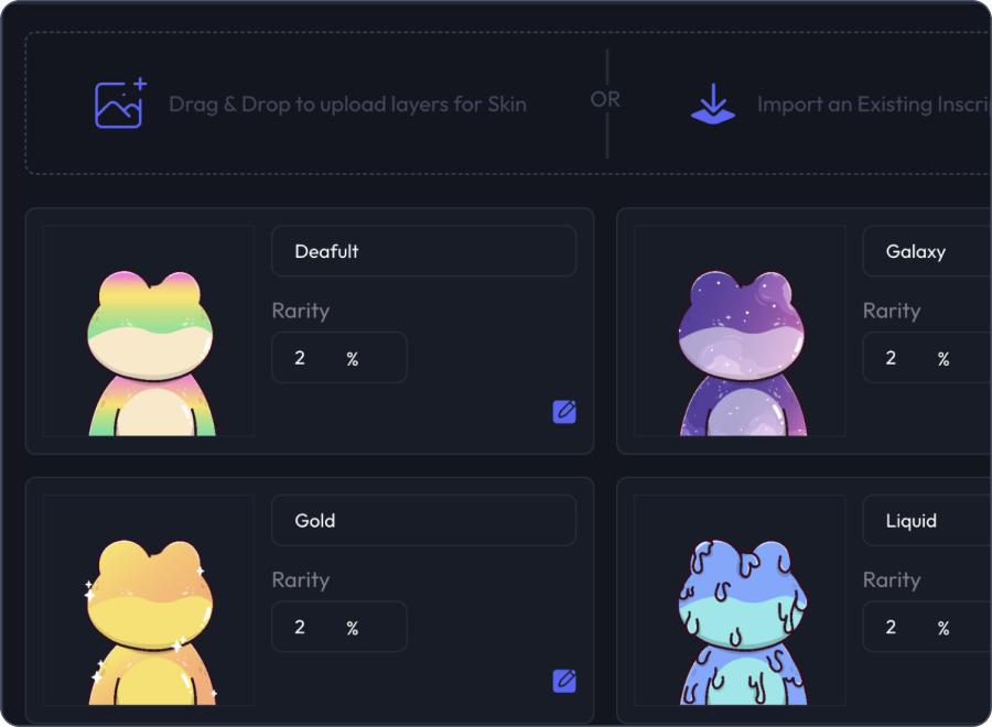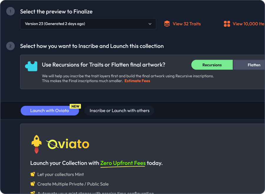 Drag and drop layers to build PFP collections with detailed traits and rarities. Import existing Ordinals, fine-tune settings, and inscribe on-chain metadata in one click. Launch with Oviato or our partners, all with zero platform fees for a limited time.